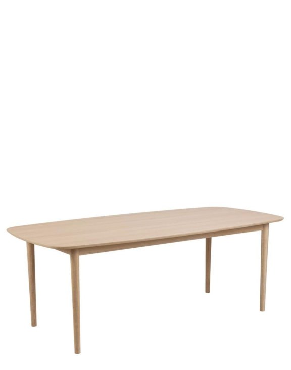 Jeho obdĺžnikový tvar, zaoblené hrany a povrchová úprava v bielom dube vytvárajú harmonickú atmosféru, ideálnu pre útulné stolovanie.