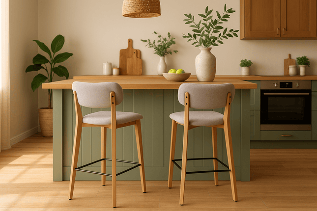 Barová stolička s opierkou na nohy v béžovej farbe Boston od značky Avida Design je elegantný, minimalistický kus nábytku, ktorý spája retro dizajn s moderným štýlom.