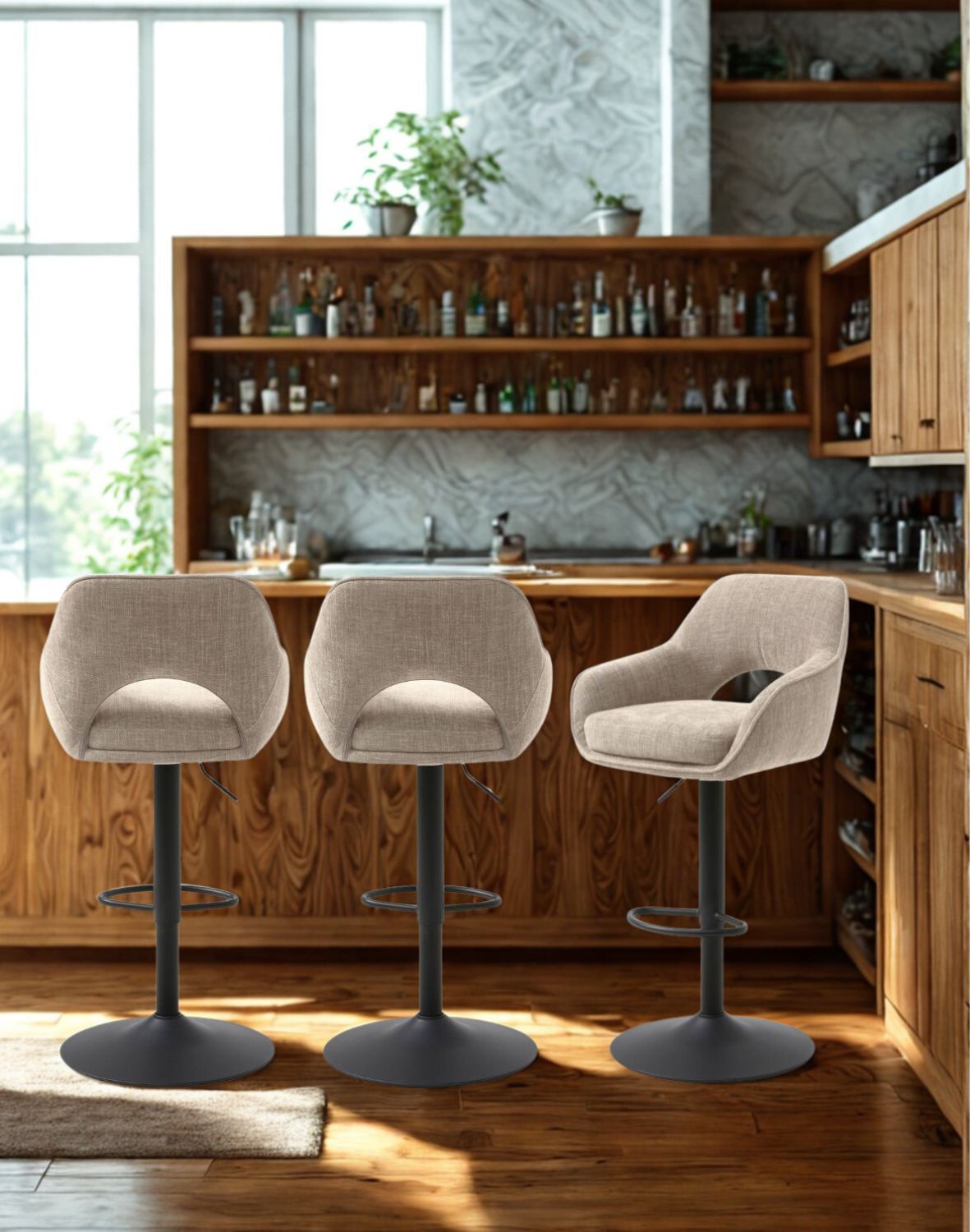 Barová stolička Cowley značky Unique je elegantný a funkčný kus nábytku, čalúnený látkou Top 120 v béžovej farbe, ktorá jej dodáva štruktúru a hĺbku.