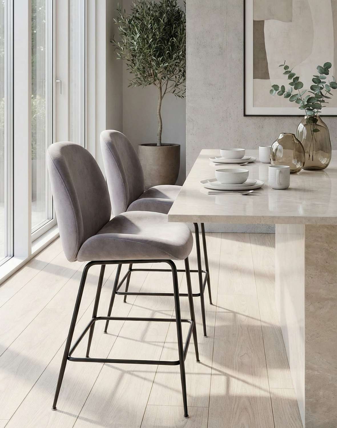 Stolička je čalúnená príjemnou zamatovou látkou dostupnou v sivom odtieni.