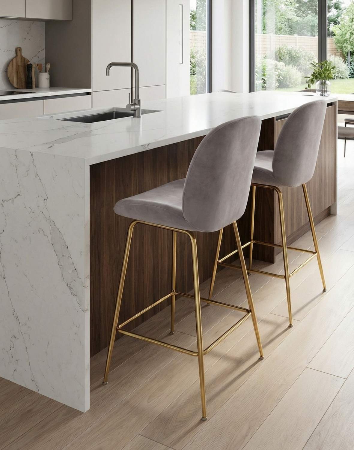 Barová stolička je čalúnená na dotyk príjemnou zamatovou látkou v šedej farbe.