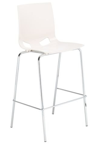 Barová stolička na kovových nohách s výrazne tvarovaným sedadlom a operadlom z polypropylénu (plast) s lesklou štruktúrou.