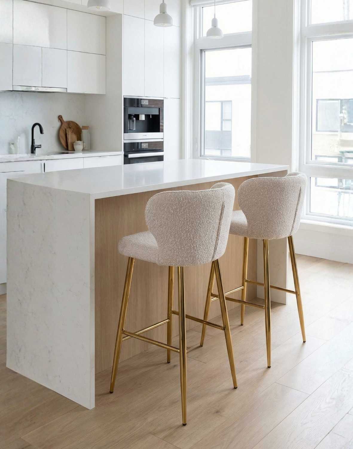 Stolička je čalúnená látkou boucle krémovej farby, ktorá je príjemná na dotyk.