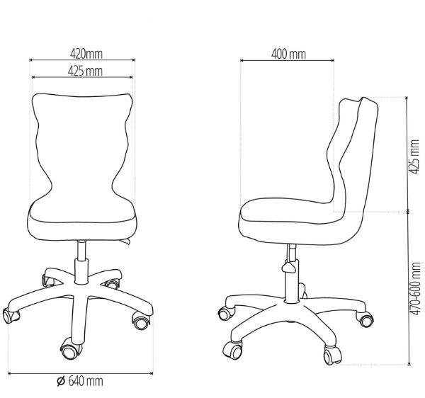 Rozmery: šírka operadla 425 mm, priemer základne 640 mm, šírka sedadla 400 mm, výška operadla 425 mm, výška sedadla 470–600 mm.