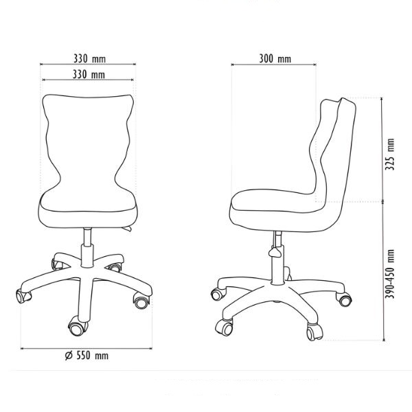 Rozmery: šírka operadla 330 mm, šírka sedáka 335 mm, priemer základne 450 mm, hĺbka sedáka 300 mm, výška operadla 325 mm, nastavenie výšky stoličky v rozmedzí 440–570 mm.