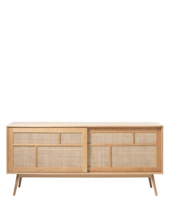 Dvierka z prírodného dubu a ratanu vnášajú do interiéru teplo a organický prvok a zároveň dodávajú komode jemne rustikálny, no stále moderný vzhľad.