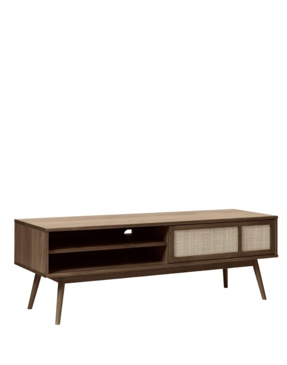 Drevená TV skrinka Barrali značky Unique je elegantný a moderný kus nábytku, ktorý spája prirodzený pôvab duba s jemným akcentom ratanu.