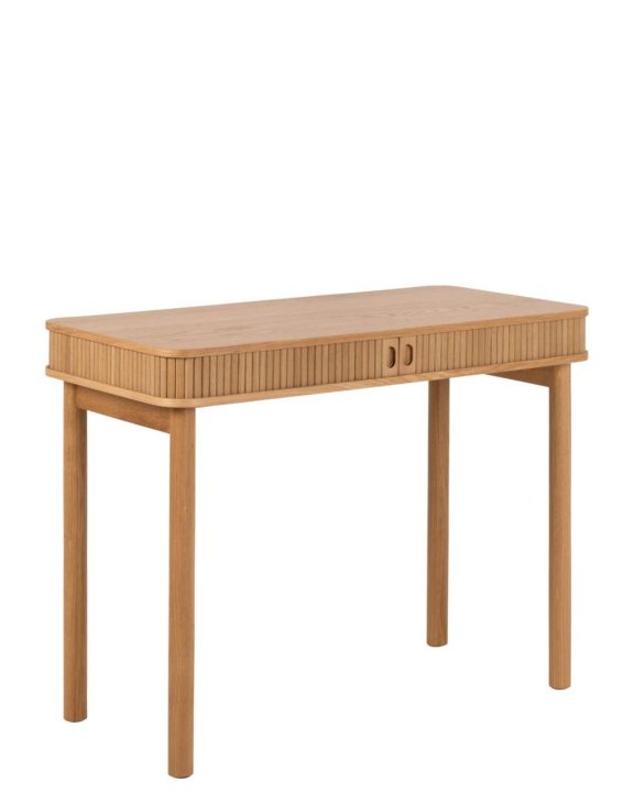 Charakteristickým prvkom tohto stola sú dekoratívne lamelové čelá a praktické riešenia, ako sú posuvné žalúziové dvierka, ktoré ukrývajú pohodlný úložný priestor na nevyhnutné veci.
