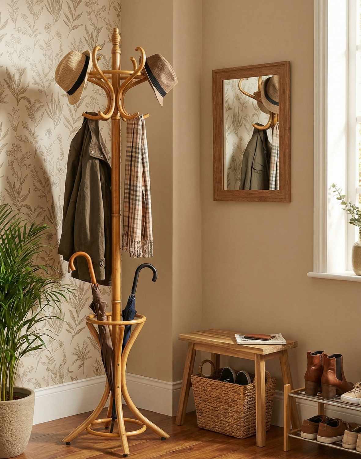 Vešiak je celý vyrobený z ohýbaného dreva, dostupný je vo farbe jelša (prírodná).