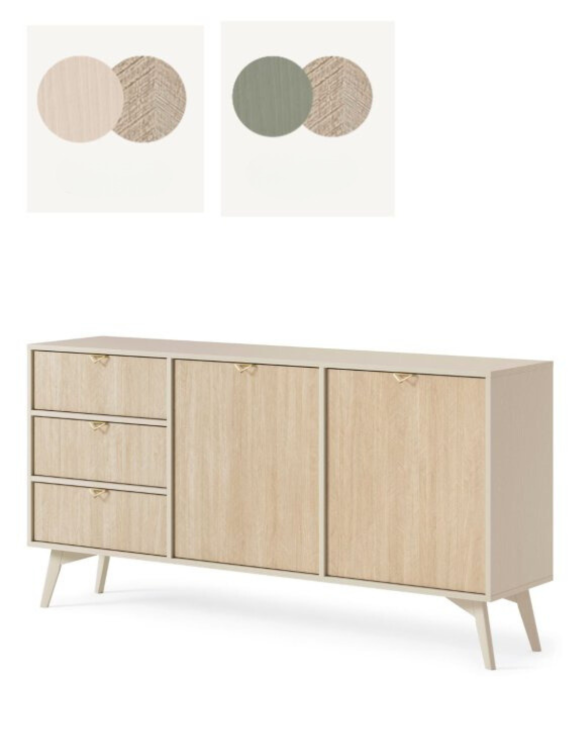 Komoda je dostupná v dvoch farbách: béžovej a eukalyptovej, čo umožňuje jej prispôsobenie rôznym interiérom a dodáva im jedinečný charakter a funkčnosť.