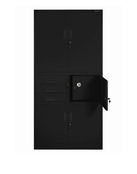 Kovová skriňa Filip II v čiernej farbe, je multifunkčný nábytok so skrinkami uzamykateľnými na kľúč a kódovým trezorom.