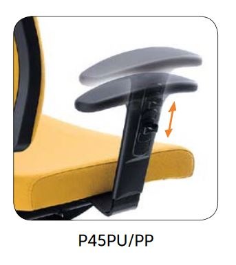 Podrúčky s pohodlnými polyuretánovými násadkami (verzia P45PU) sú výškovo nastaviteľné v rozsahu 7 cm. Správne nastavenie predlaktia (v uhlu 90° voči trupu) odľahčuje chrbtové svaly pri dlhodobom sedení.