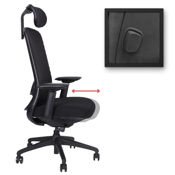 Nastaviteľná hĺbka sedadla (pomocou tlačidla umiestneného pod sedadlom) zabezpečuje optimálnu oporu stehien a kolien, čo je kľúčové pre správne sedenie.