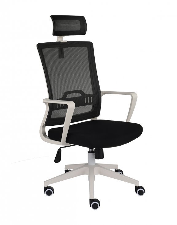Sedák je čalúnený čiernou tkaninou, zatiaľ čo operadlo aj hlavová opierka sú potiahnuté čiernou sieťovinou.