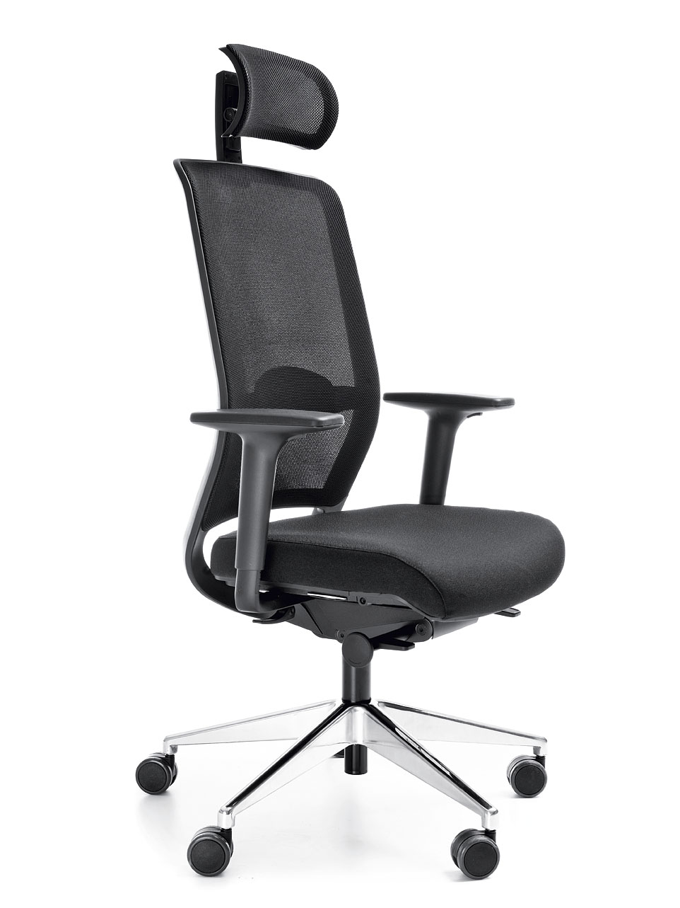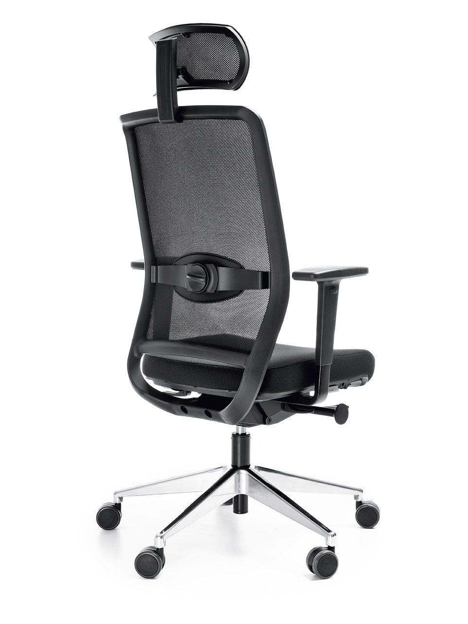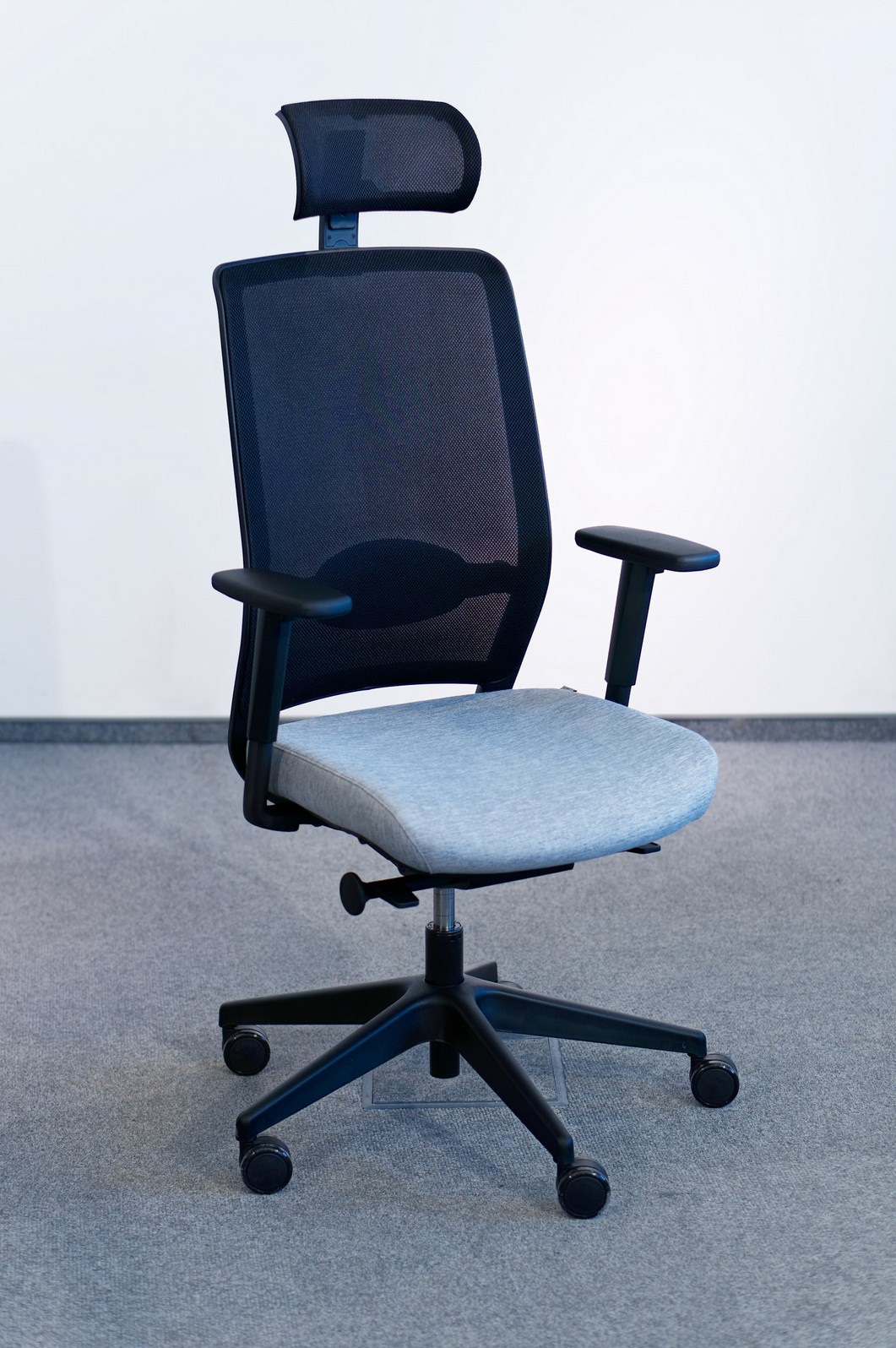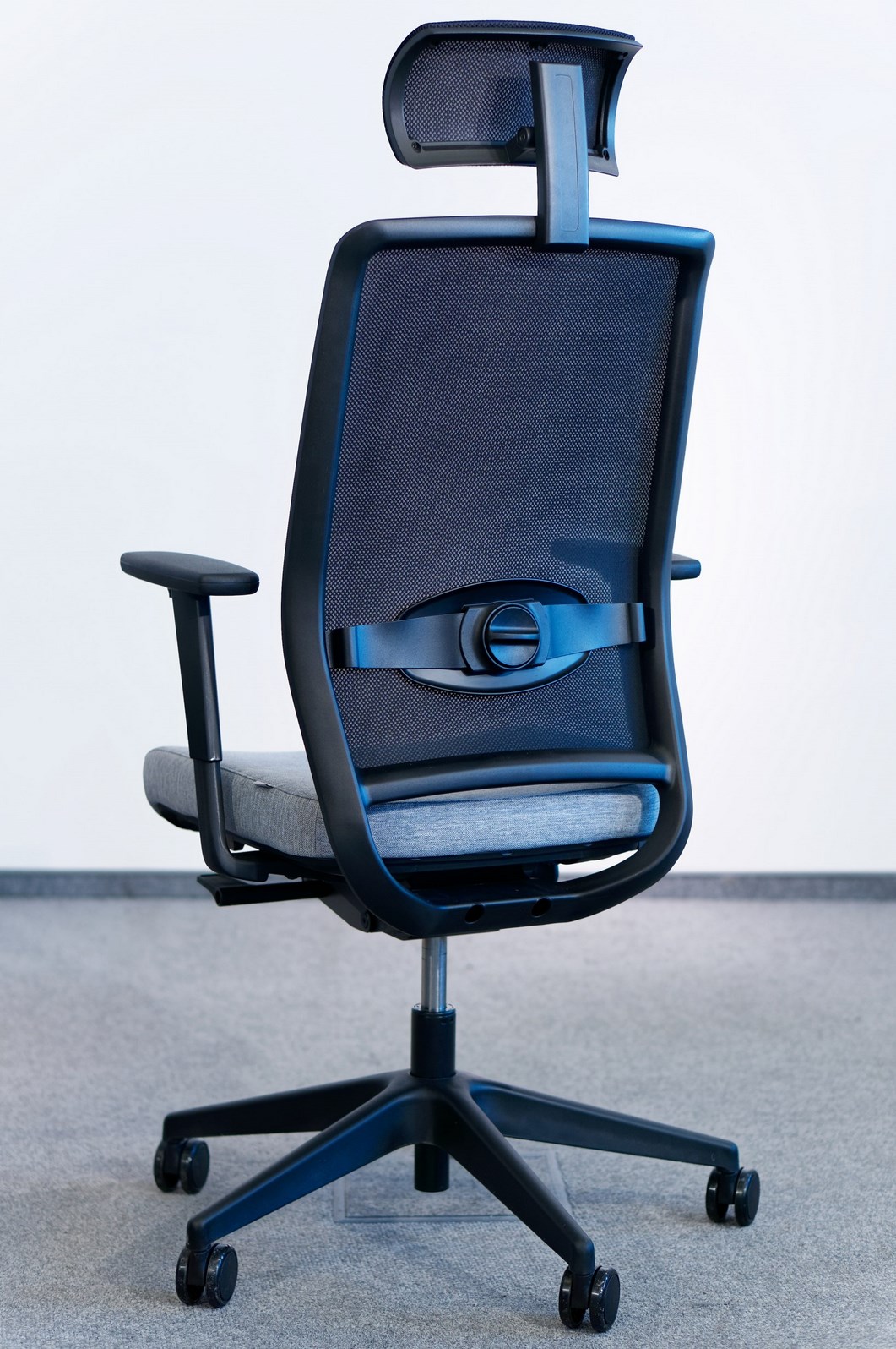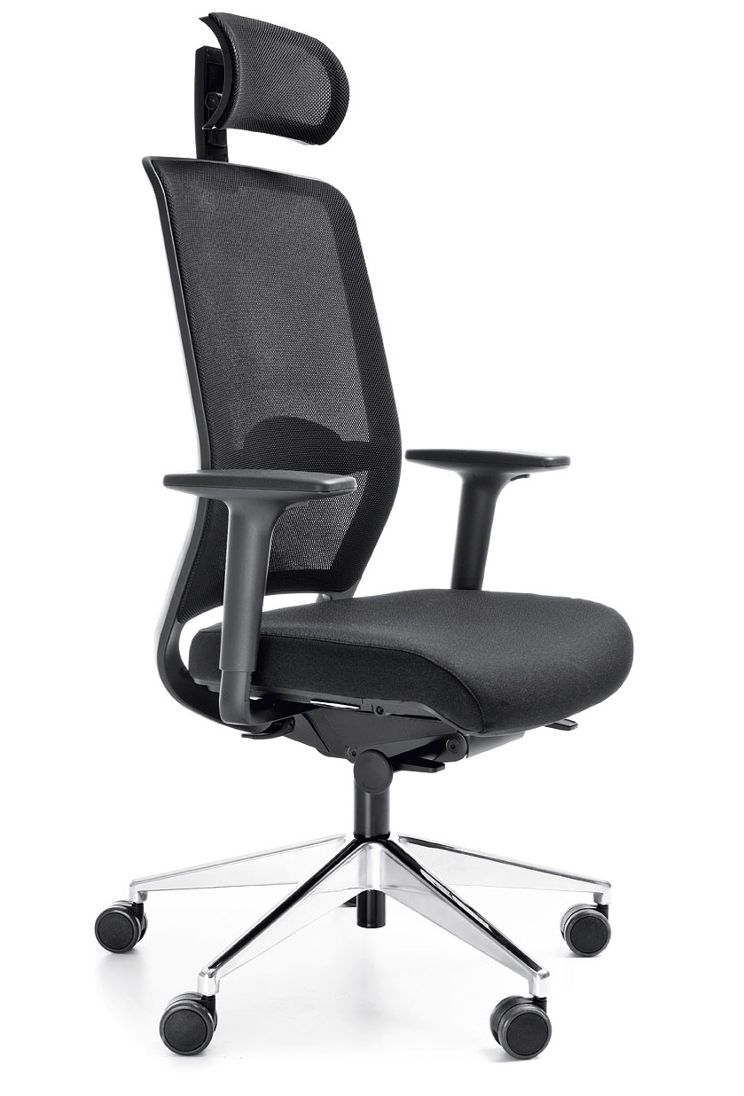 Moderná, ergonomická kancelárska stolička so sieťovaným operadlom, pokročilým mechanizmom a reguláciou: výšky opierky hlavy, podrúčok a inovatívnej bedrovej opierky.