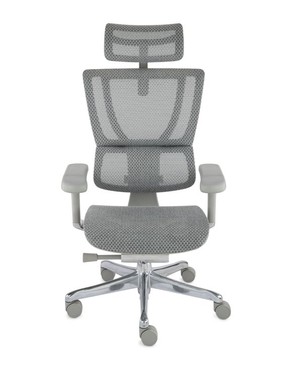 Opierka hlavy, operadlo a sedák sú čalúnené inovatívnou sieťovinou v šedej farbe.