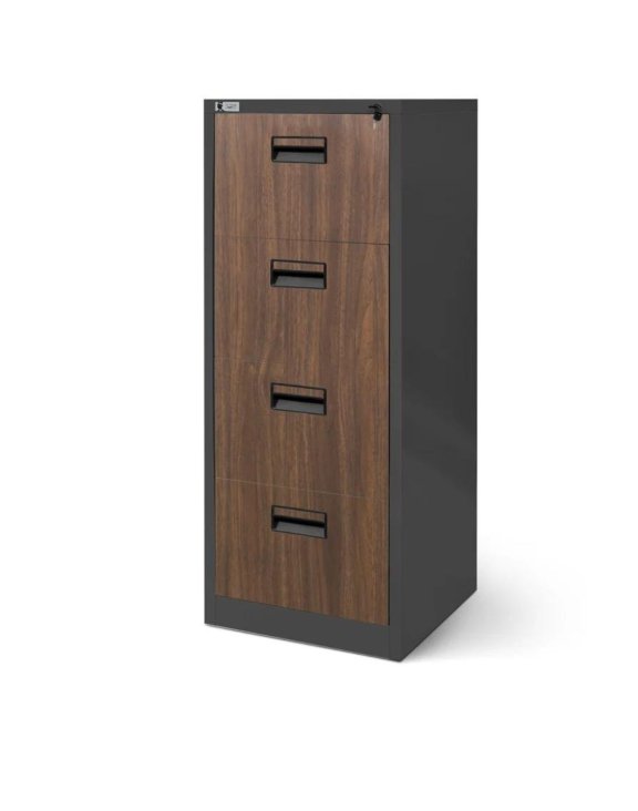 Antracitovo-orechová kartotéková skriňa Sara so štyrmi zásuvkami je kompaktný kus nábytku, ktorý je nenahraditeľný v každej kancelárii, úrade, lekárskej ordinácii a všade tam, kde je potrebné uchovávať dokumenty.