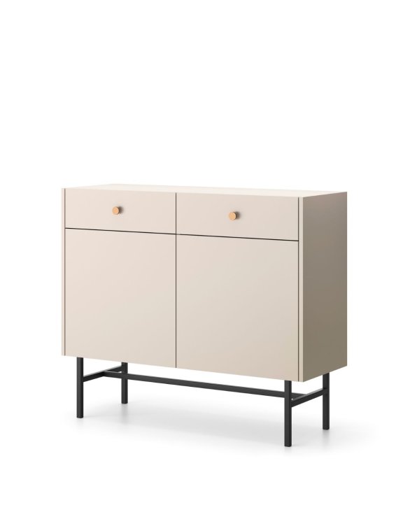 Komoda Diva v odtieni kašmír je elegantná skrinka so zásuvkami a dvierkami.