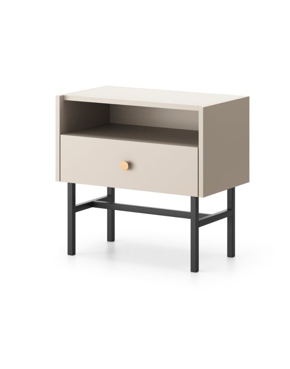Nočný stolík Diva v elegantnej farbe kašmír je harmonickým spojením moderného dizajnu a funkčnosti.