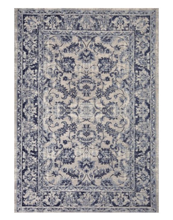 Koberec Tebriz Antique Blue od značky Fargotex je jedinečný koberec s krásnym kvetinovým vzorom vo farbách tmavo modrej, modrej, šedej a bielej.