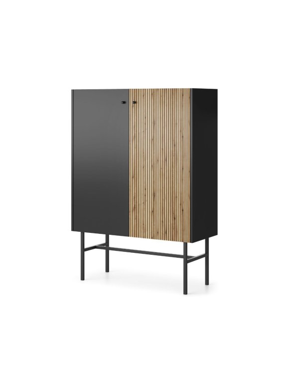 Matná čierna konštrukcia v kombinácii s dekoratívnym lamelovým čelom v odtieni dreva upúta pozornosť a dokonale zapadá do aktuálnych trendov v interiérovom dizajne.