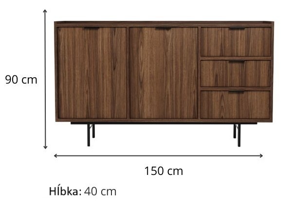 Optimální rozměry – šířka 150 cm, výška 90 cm a hloubka 40 cm dělají z komody ideální řešení i pro menší prostory, aniž by ztratila na kapacitě.