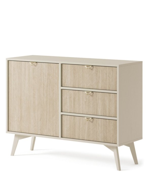 Komoda ponúka úložný priestor v podobe jednej uzatvárateľnej skrinky s policou a troch priestranných zásuviek na guľôčkových výsuvoch, ktoré zaisťujú plynulé a tiché vysúvanie.