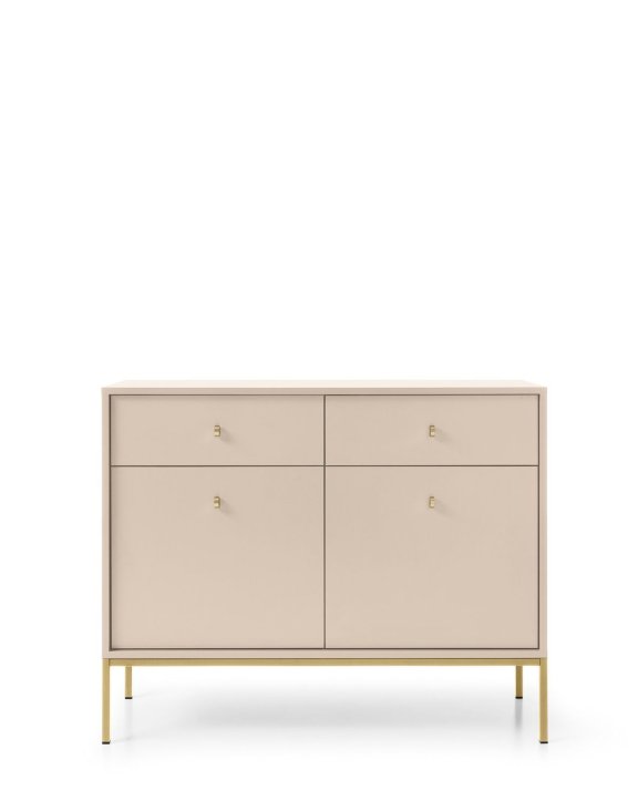 Komoda Mono béžová so zásuvkami (MKSZ104) značky Piaski so zlatým rámom je elegantný a funkčný kus nábytku, ktorý sa skvele hodí do obývačky.