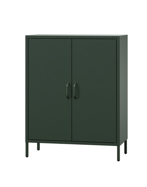 Dvojdverová komoda na nohách s policami VITO značky Jan Nowak v tmavo zelenej farbe skvele doplní aranžmány v modernom štýle.