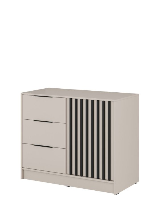 Charakteristickým prvkom komody sú čierne lamely umiestnené na dvierkach, ktoré podčiarkujú jej jedinečný štýl a dopĺňajú ju čierne plastové úchytky.
