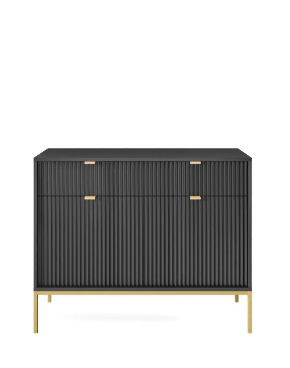 Predná časť komody je vyrobená z ryhovanej MDF dosky s hrúbkou 18 mm, čo jej dodáva eleganciu a štýl. Okraje prednej časti sú tiež zosilnené ABS plastom a hliníková úchytka dodáva moderný vzhľad. Nohy komody sú podopreté oceľovými rámami, ktoré boli práškovo lakované, čo zaručuje ich trvanlivosť a stabilitu.