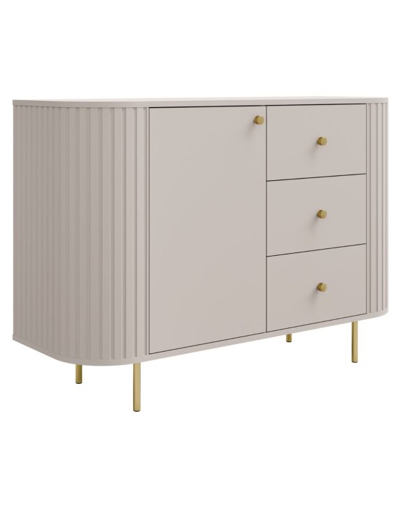 Komoda Ovalio (813) zaujme harmonickým tvarom, ktorý kombinuje minimalistický dizajn s jemným frézovaním na bokoch, čo jej dodáva jedinečný charakter.