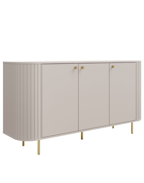Charakteristické vertikálne frézovanie na zaoblených bokoch dodáva celku ľahkosť a štýl, zatiaľ čo zlaté detaily – nožičky a úchyty – vytvárajú výrazný kontrast a elegantný vzhľad.