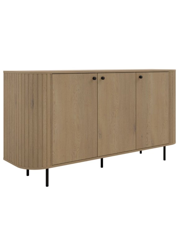 Charakteristické vertikálne frézovanie na zaoblených bokoch dodáva celku ľahkosť a štýl, zatiaľ čo čierne detaily – nožičky a úchyty – vytvárajú výrazný kontrast s teplým odtieňom dreva.