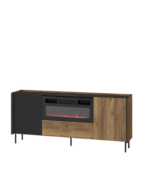 Tento výnimočný kus nábytku spája industriálny štýl s prirodzeným teplom dreva a ponúka možnosť vybaviť ho voliteľným elektrickým krbom, ktorý vytvára útulnú atmosféru.