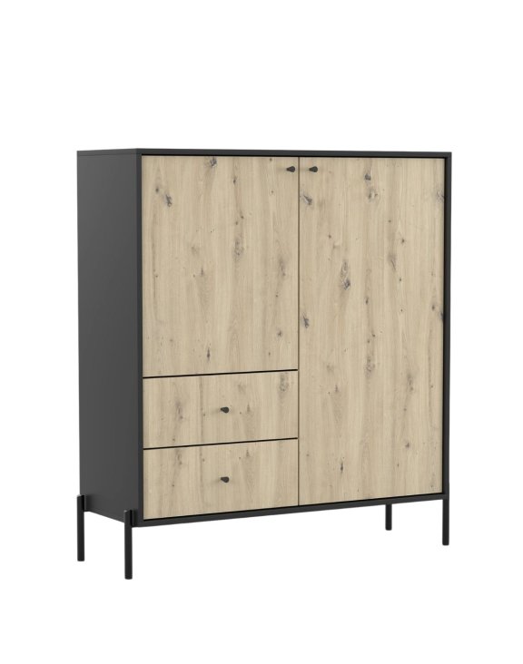 Vybavená dvoma priestrannými skrinkami a dvoma funkčnými zásuvkami s čiernymi kovovými úchytkami, komoda poskytuje dostatok miesta na uloženie oblečenia, dokumentov, dekorácií alebo každodenných potrieb.
