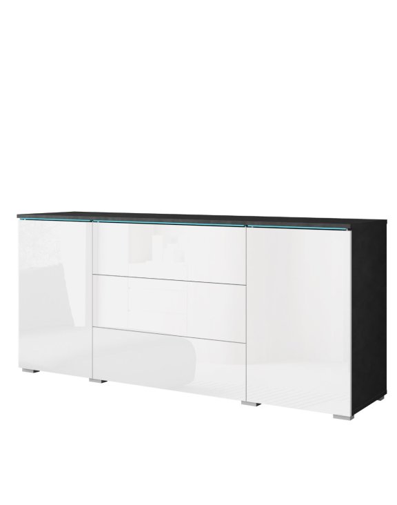 Čelá a korpus komody v kontrastných farbách tvoria harmonický celok a decentná LED lišta v hornej časti nábytku prináša príjemné, jemné osvetlenie, ktoré večer zvýrazní moderný charakter interiéru.