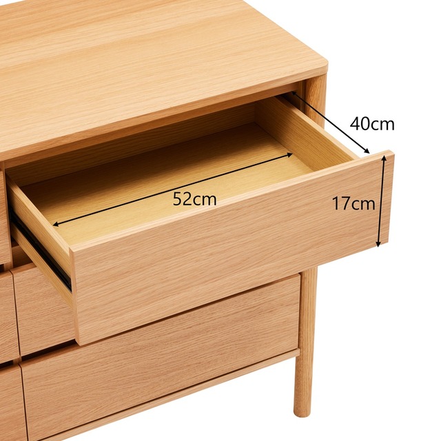 Vyrobená s dôrazom na každý detail, komoda je povrchovo upravená dubovou dyhou v odtieni prírodného duba, čo zvýrazňuje štruktúru dreva a dodáva interiéru teplý, nadčasový charakter.