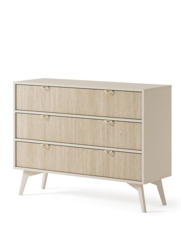 Zlaté úchytky skvele ladia s celkom a dodávajú komode jemný nádych luxusu.