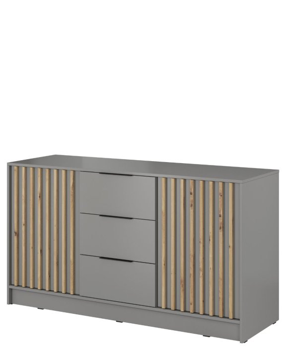 Charakteristickým prvkom komody sú lamely v odtieni dub artisan umiestnené na dvierkach, ktoré jej dodávajú jedinečný štýl a charakter.