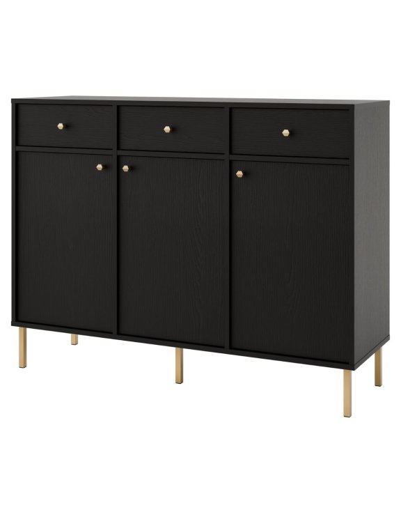 Ľahkosť a moderný charakter podčiarkujú zlaté kovové nožičky s výškou 15 cm a zlaté úchytky – kontrastné detaily, ktoré v kombinácii s čiernym odtieňom vytvárajú elegantný celok.