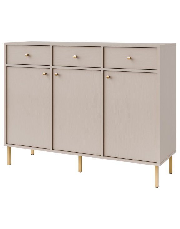 Ľahký a moderný charakter nábytku podčiarkujú zlaté kovové nožičky s výškou 15 cm a zlaté úchytky, ktoré vytvárajú elegantný kontrast a dodávajú komode nadčasový vzhľad.
