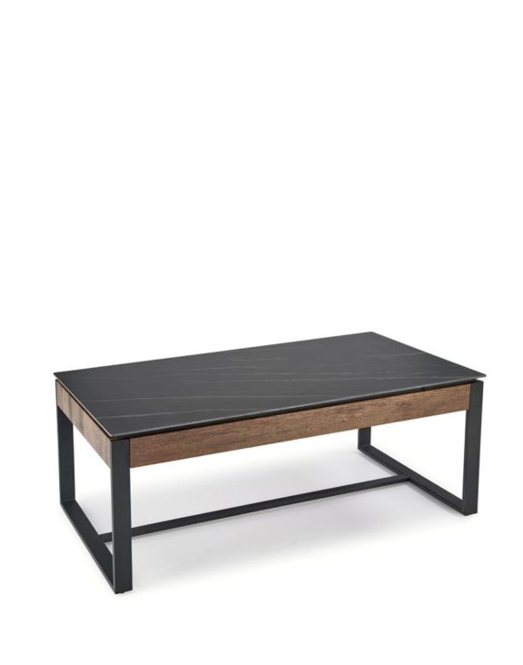 Obdĺžniková doska, pripomínajúca čierny mramor, v kombinácii s čiernym rámom a orechovým drevom tvorí jednoduchú a efektívnu kompozíciu, ktorá je nielen veľmi funkčná, ale aj vizuálne atraktívna.
