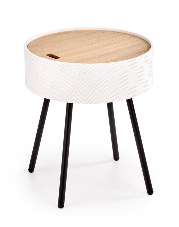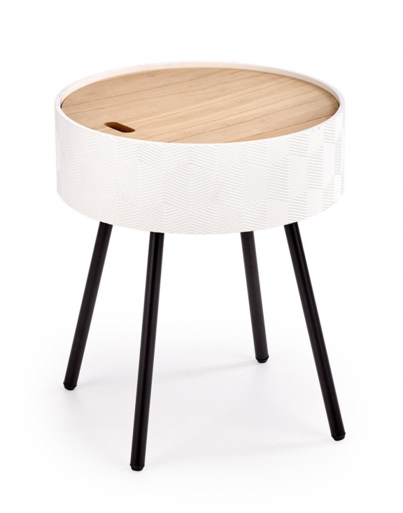 Poznávacím znamením stola je odnímateľná horná doska, ktorú možno použiť ako podnos, a samotný nábytok preberá aj funkciu úložného boxu na drobné predmety.