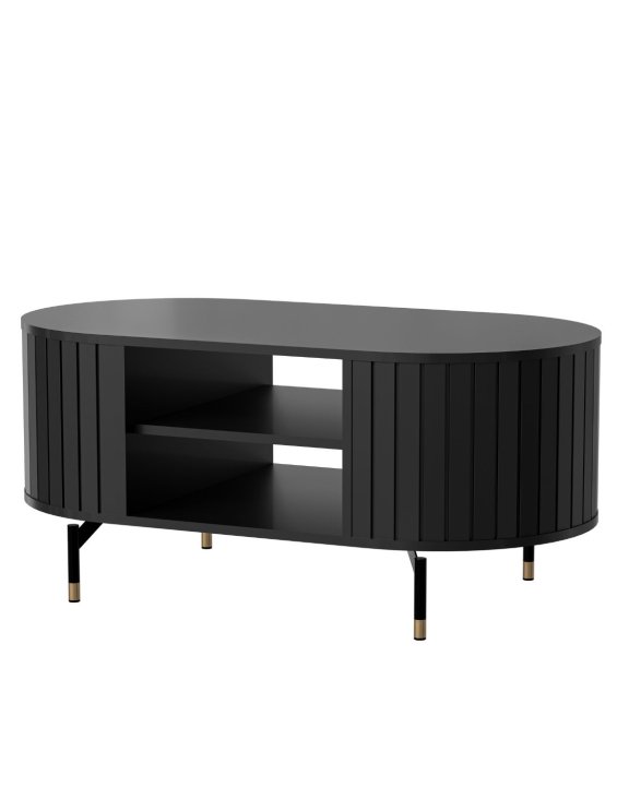 Oválny stolík na nožičkách s policami zodpovedá súčasným interiérovým trendom - vysoké nohy, zaoblené tvary a farby podčiarkujúce štýl.