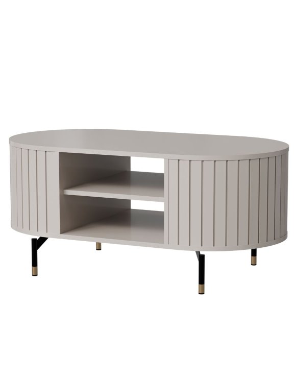 Oválný konferenční stolek na nožkách s policemi odpovídá aktuálním interiérovým trendům – vysoké nohy, zaoblené tvary a barvy zdůrazňující styl.