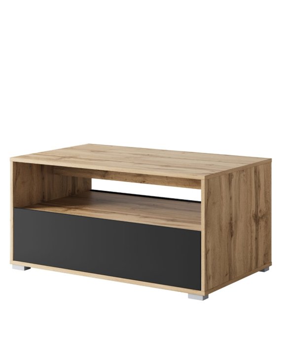 Konferenční stolek se vyznačuje jednoduchým, geometrickým tvarem v dekoru dub wotan, který je kontrastně doplněn grafitovými čely. Vzniká tak moderní a nadčasová kombinace, ideální do interiérů zařízených v moderním, minimalistickém nebo industriálním stylu.