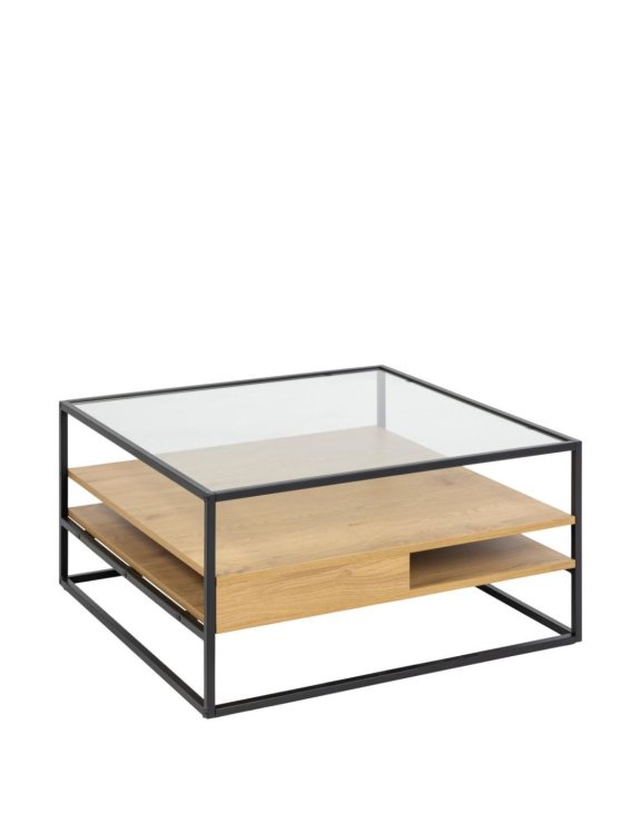 Priehľadná doska z tvrdeného skla dodáva ľahkosť, zatiaľ čo polica v prevedení divoký dub s melamínovou úpravou ponúka praktický úložný priestor.