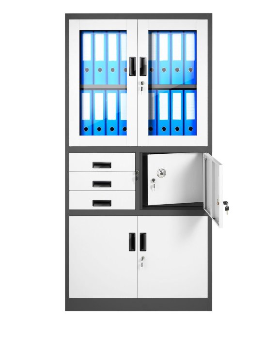 Kovová skriňa Filip s trezorom v antracitovo-bielej farbe, je nábytok spĺňajúci najrôznejšie potreby rôznych používateľov.