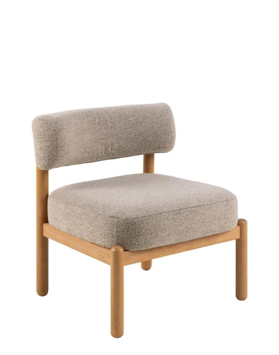 Burley je vyrobené z odolného, zaobleného dubového dreva v kombinácii s béžovým čalúnením bouclé (Monza).